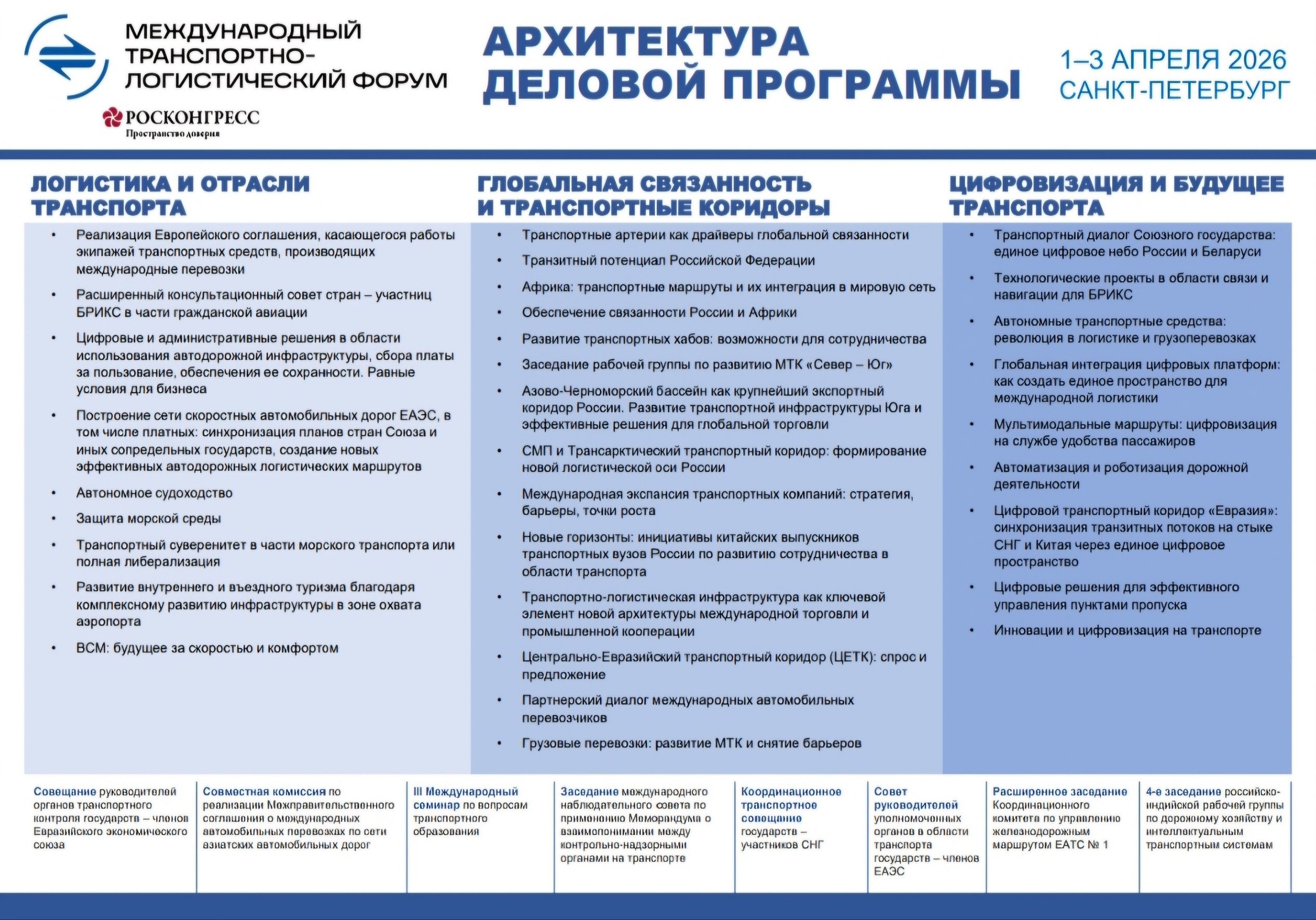 Архитектура деловой программы форума сосредоточена вокруг 3 основных тематических треков. Также на полях форума пройдут стратегические диалоги и мероприятия в рамках работы международных транспортных организаций.